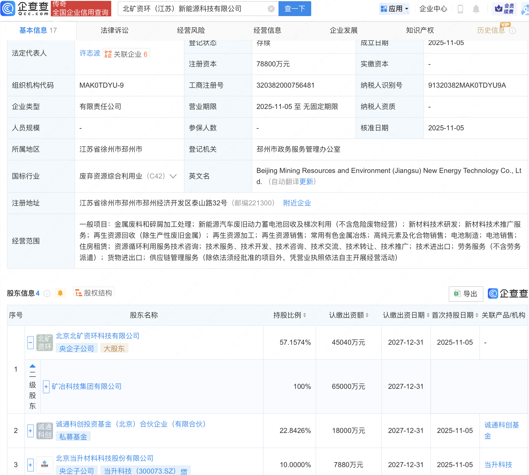 近日,北矿资环(江苏)新能源科技有限公司成立,注册资本7.88亿元,经营范围包含:常用有色金属冶炼;高纯元素及化合物销售;电池制造;电池销售等。企查查股权穿透显示,该公司由矿冶科技集团有限公司全资子公司北京北矿资环科技有限公司、诚通科创投资基金(北京)合伙企业(有限合伙)、当升科技(300073)等共同持股。