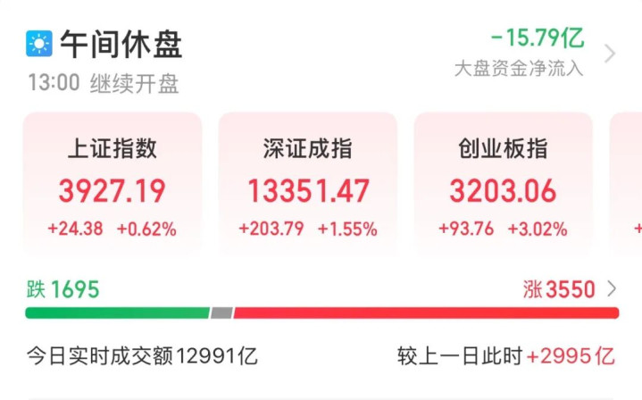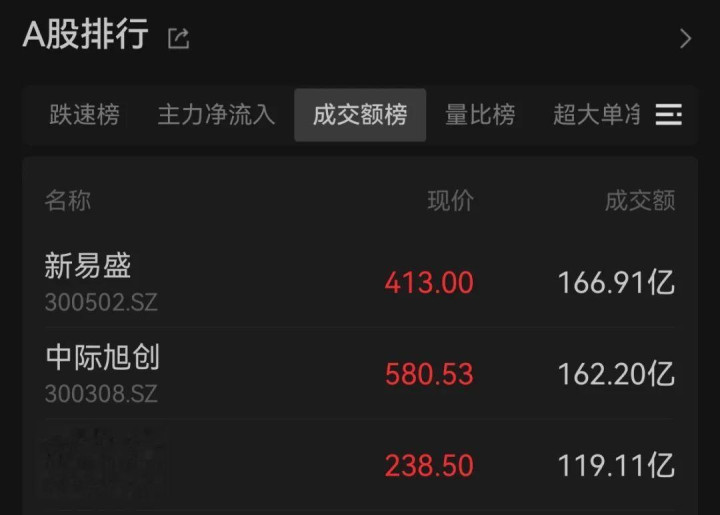 12月8日早盘,A股市场震荡反弹,算力硬件股集体大涨,助推创业板指拉升超3%。截至午间收盘,上证指数报3927.19点,涨0.62%;深证成指、创业板指分别涨1.55%、3.02%。沪深北三市半日成交12991亿元,较上日同期放量2995亿元;CPO概念三大龙头新易盛、中际旭创、天孚通信(“易中天”)成交额均超百亿元,排名全市场前三。